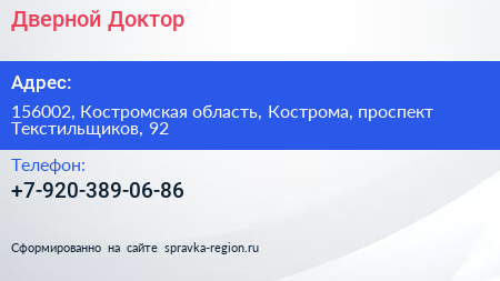 Дверной Доктор по адресу 156002, Костромская область, Кострома, проспект Текстильщиков, 92 в дальнейшем Организация, размещена в следующих категориях: