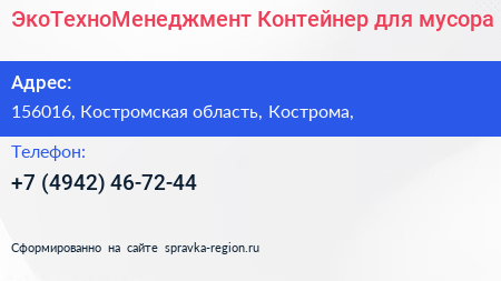 ЭкоТехноМенеджмент, Контейнер для мусора по адресу 156016, Костромская область, Кострома, в дальнейшем Организация, размещена в следующих категориях: