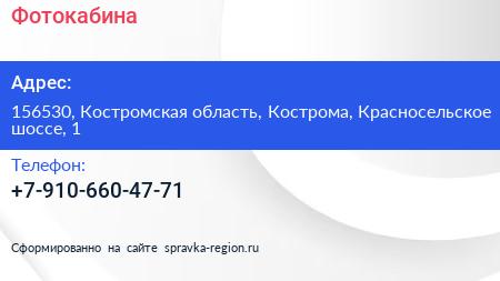Фотокабина по адресу 156530, Костромская область, Кострома, Красносельское шоссе, 1 в дальнейшем Организация, размещена в следующих категориях: