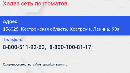 Халва, сеть почтоматов по адресу 156025, Костромская область, Кострома, Ленина, 93а в дальнейшем Организация, размещена в следующих категориях: