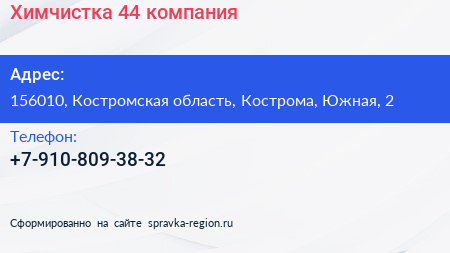 Химчистка 44, компания по адресу 156010, Костромская область, Кострома, Южная, 2 в дальнейшем Организация, размещена в следующих категориях: