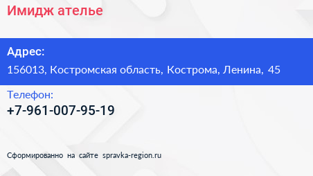 Имидж, ателье по адресу 156013, Костромская область, Кострома, Ленина, 45 в дальнейшем Организация, размещена в следующих категориях: