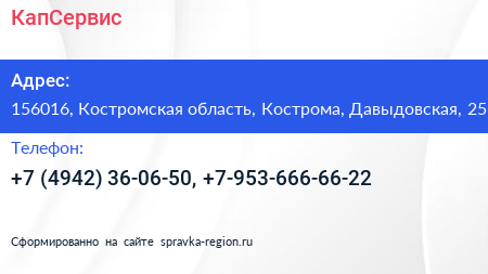 КапСервис по адресу 156016, Костромская область, Кострома, Давыдовская, 25 в дальнейшем Организация, размещена в следующих категориях: