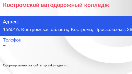 Костромской автодорожный колледж по адресу 156016, Костромская область, Кострома, Профсоюзная, 38 в дальнейшем Организация, размещена в следующих категориях: