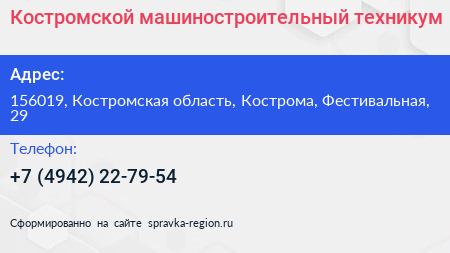 Костромской машиностроительный техникум по адресу 156019, Костромская область, Кострома, Фестивальная, 29 в дальнейшем Организация, размещена в следующих категориях: