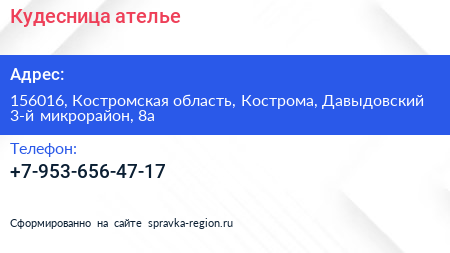 Кудесница, ателье по адресу 156016, Костромская область, Кострома, Давыдовский 3-й микрорайон, 8а в дальнейшем Организация, размещена в следующих категориях: