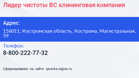 Лидер чистоты-ВС, клининговая компания по адресу 156011, Костромская область, Кострома, Магистральная, 59 в дальнейшем Организация, размещена в следующих категориях: