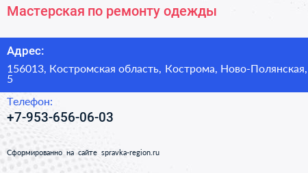 Мастерская по ремонту одежды по адресу 156013, Костромская область, Кострома, Ново-Полянская, 5 в дальнейшем Организация, размещена в следующих категориях: