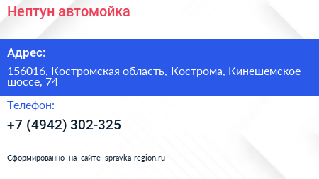 Нептун, автомойка по адресу 156016, Костромская область, Кострома, Кинешемское шоссе, 74 в дальнейшем Организация, размещена в следующих категориях: