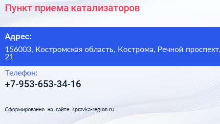 Пункт приема катализаторов по адресу 156003, Костромская область, Кострома, Речной проспект, 21 в дальнейшем Организация, размещена в следующих категориях: