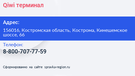 Qiwi, терминал по адресу 156016, Костромская область, Кострома, Кинешемское шоссе, 66 в дальнейшем Организация, размещена в следующих категориях: