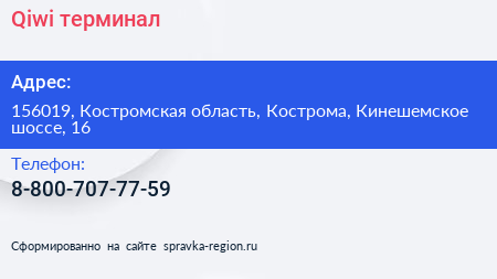 Qiwi, терминал по адресу 156019, Костромская область, Кострома, Кинешемское шоссе, 16 в дальнейшем Организация, размещена в следующих категориях: