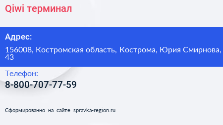 Qiwi, терминал по адресу 156008, Костромская область, Кострома, Юрия Смирнова, 43 в дальнейшем Организация, размещена в следующих категориях: