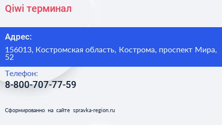 Qiwi, терминал по адресу 156013, Костромская область, Кострома, проспект Мира, 52 в дальнейшем Организация, размещена в следующих категориях: