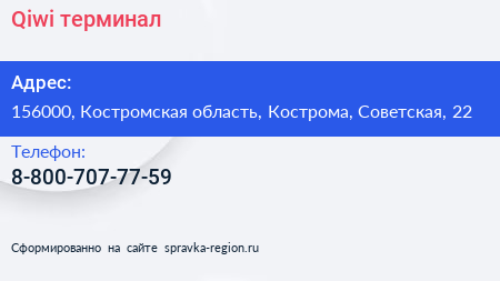 Qiwi, терминал по адресу 156000, Костромская область, Кострома, Советская, 22 в дальнейшем Организация, размещена в следующих категориях: