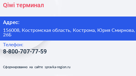 Qiwi, терминал по адресу 156008, Костромская область, Кострома, Юрия Смирнова, 26Б в дальнейшем Организация, размещена в следующих категориях: