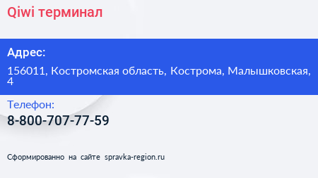 Qiwi, терминал по адресу 156011, Костромская область, Кострома, Малышковская, 4 в дальнейшем Организация, размещена в следующих категориях: