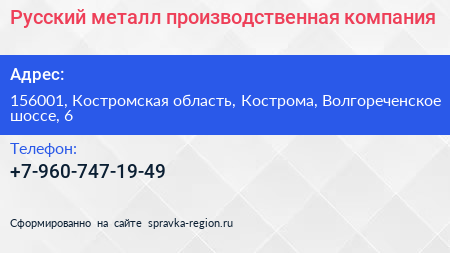 Русский металл, производственная компания по адресу 156001, Костромская область, Кострома, Волгореченское шоссе, 6 в дальнейшем Организация, размещена в следующих категориях:
