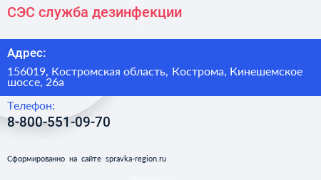 СЭС, служба дезинфекции по адресу 156019, Костромская область, Кострома, Кинешемское шоссе, 26а в дальнейшем Организация, размещена в следующих категориях: