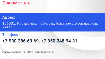 Союзметалл по адресу 156001, Костромская область, Кострома, Ярославская, 24а/2 в дальнейшем Организация, размещена в следующих категориях: