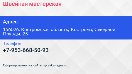 Швейная мастерская по адресу 156026, Костромская область, Кострома, Северной Правды, 25 в дальнейшем Организация, размещена в следующих категориях:
