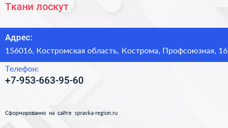 Ткани & лоскут по адресу 156016, Костромская область, Кострома, Профсоюзная, 16 в дальнейшем Организация, размещена в следующих категориях: