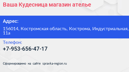 Ваша Кудесница, магазин-ателье по адресу 156014, Костромская область, Кострома, Индустриальная, 11а в дальнейшем Организация, размещена в следующих категориях: