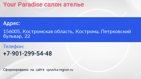 Your Paradise, салон-ателье по адресу 156005, Костромская область, Кострома, Петрковский бульвар, 22 в дальнейшем Организация, размещена в следующих категориях: