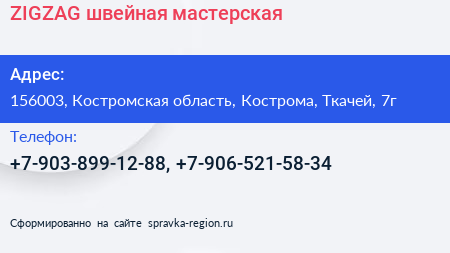 ZIGZAG, швейная мастерская по адресу 156003, Костромская область, Кострома, Ткачей, 7г в дальнейшем Организация, размещена в следующих категориях: