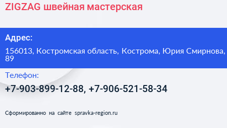 ZIGZAG, швейная мастерская по адресу 156013, Костромская область, Кострома, Юрия Смирнова, 89 в дальнейшем Организация, размещена в следующих категориях: