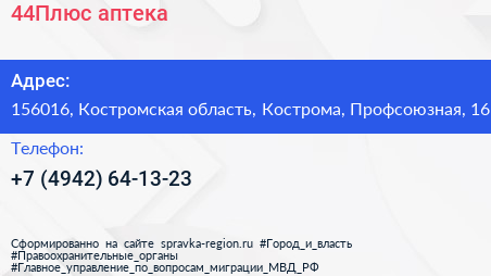 44Плюс, аптека по адресу 156016, Костромская область, Кострома, Профсоюзная, 16 в дальнейшем Организация, размещена в следующих категориях: