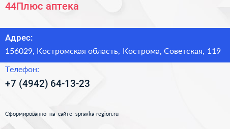 44Плюс, аптека по адресу 156029, Костромская область, Кострома, Советская, 119 в дальнейшем Организация, размещена в следующих категориях: