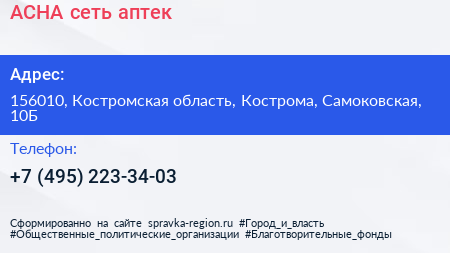 АСНА, сеть аптек по адресу 156010, Костромская область, Кострома, Самоковская, 10Б в дальнейшем Организация, размещена в следующих категориях: