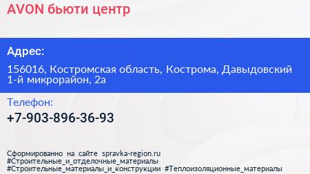 AVON, бьюти-центр по адресу 156016, Костромская область, Кострома, Давыдовский 1-й микрорайон, 2а в дальнейшем Организация, размещена в следующих категориях: