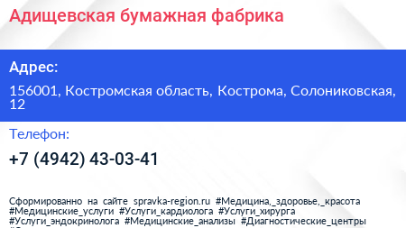 Адищевская бумажная фабрика по адресу 156001, Костромская область, Кострома, Солониковская, 12 в дальнейшем Организация, размещена в следующих категориях: