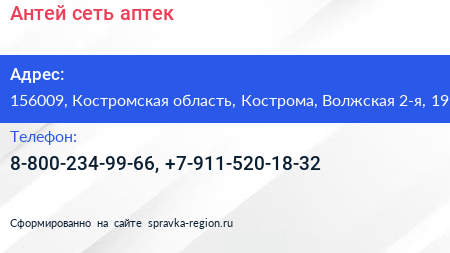 Антей, сеть аптек по адресу 156009, Костромская область, Кострома, Волжская 2-я, 19 в дальнейшем Организация, размещена в следующих категориях: