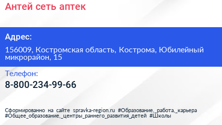 Антей, сеть аптек по адресу 156009, Костромская область, Кострома, Юбилейный микрорайон, 15 в дальнейшем Организация, размещена в следующих категориях: