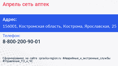 Апрель, сеть аптек по адресу 156001, Костромская область, Кострома, Ярославская, 25 в дальнейшем Организация, размещена в следующих категориях: