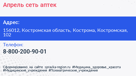 Апрель, сеть аптек по адресу 156012, Костромская область, Кострома, Костромская, 102 в дальнейшем Организация, размещена в следующих категориях: