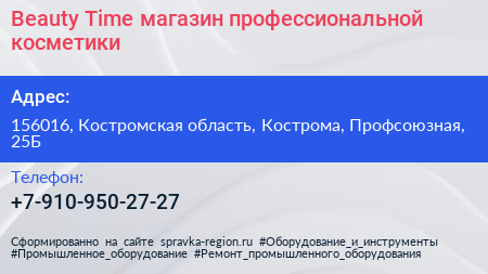 Beauty Time, магазин профессиональной косметики по адресу 156016, Костромская область, Кострома, Профсоюзная, 25Б в дальнейшем Организация, размещена в следующих категориях: