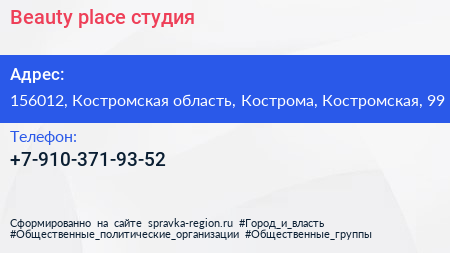 Beauty place, студия по адресу 156012, Костромская область, Кострома, Костромская, 99 в дальнейшем Организация, размещена в следующих категориях: