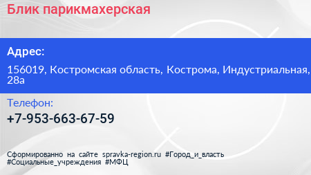 Блик, парикмахерская по адресу 156019, Костромская область, Кострома, Индустриальная, 28а в дальнейшем Организация, размещена в следующих категориях: