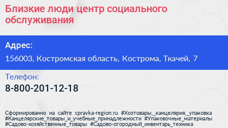Близкие люди, центр социального обслуживания по адресу 156003, Костромская область, Кострома, Ткачей, 7 в дальнейшем Организация, размещена в следующих категориях: