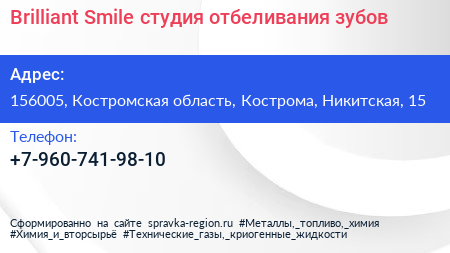 Brilliant Smile, студия отбеливания зубов по адресу 156005, Костромская область, Кострома, Никитская, 15 в дальнейшем Организация, размещена в следующих категориях: