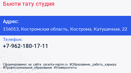 Бьюти, тату-студия по адресу 156013, Костромская область, Кострома, Катушечная, 22 в дальнейшем Организация, размещена в следующих категориях: