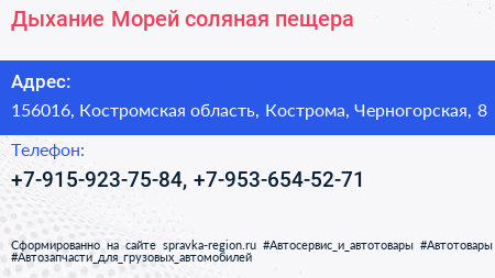 Дыхание Морей, соляная пещера по адресу 156016, Костромская область, Кострома, Черногорская, 8 в дальнейшем Организация, размещена в следующих категориях:
