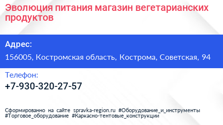 Эволюция питания, магазин вегетарианских продуктов по адресу 156005, Костромская область, Кострома, Советская, 94 в дальнейшем Организация, размещена в следующих категориях: