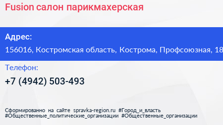 Fusion, салон-парикмахерская по адресу 156016, Костромская область, Кострома, Профсоюзная, 18 в дальнейшем Организация, размещена в следующих категориях: