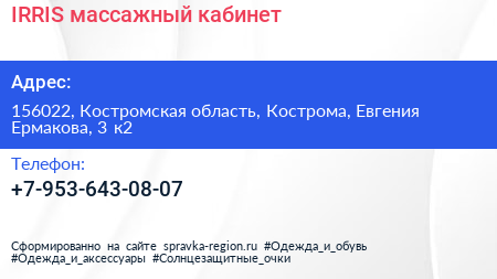IRRIS, массажный кабинет по адресу 156022, Костромская область, Кострома, Евгения Ермакова, 3 к2 в дальнейшем Организация, размещена в следующих категориях: