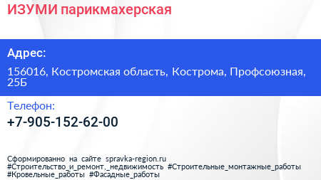 ИЗУМИ, парикмахерская по адресу 156016, Костромская область, Кострома, Профсоюзная, 25Б в дальнейшем Организация, размещена в следующих категориях: